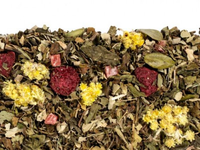 Натуральная травяная смесь из ягод малины,листев мяты, ежевики, мелиссы, брусники и цветков бессмертника . Кладезь полезных микроэлиментов для красоты и здоровья. Рекомендуем пить на ночь для прекрасного сна. Прекрасно утоляет жажду. Состав - "Листья ежевики Чай зеленый рассыпной листовой крупный Ананас сушеный кубики (ананас, сахар, регулятор кислотности: лимонная кислота) листья мелиссы Листья мяты перечной Лист брусники Ароматизаторы Ягоды малины Цветки бессмертника"