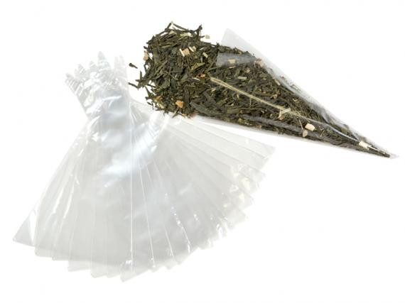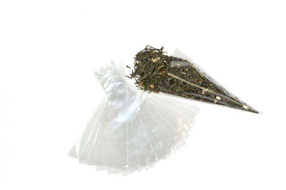 Пакет прозрачный формы "конус". Размеры: высота 33 см, ширина- 19 см. Оптимален для использования в качестве упаковки весового чая, кофе или сладостей.