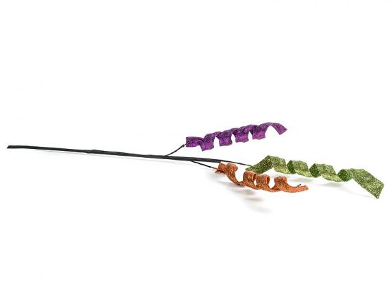 Декоративный элемент в виде спиралей. Имеет яркий блеск за счет специального напыления. Цвета спиралей салатовый, оранжевый и фиолетовый. Основа каждой веточки гибкая, что позволяет использовать ее для огибания ручки подарочной корзины или для основы чайнного букета.