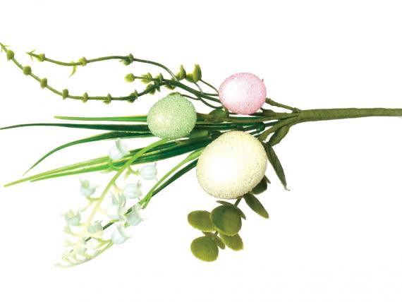 Пасха - один из самых светлых праздников! Дарить на Пасху принято куличи и пасхальные яйца. Мы предлагаем дополнить подарок пасхальным декором. Он отлично подойдет для оформления чайного букета или чайного подарка. Веточка содержит нежные цветочки ландыша, листья и декоративные пасхальные яйца. Отлично подходит для завершающего штриха оформления пасхального подарка!