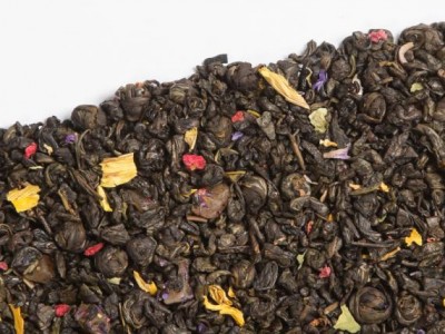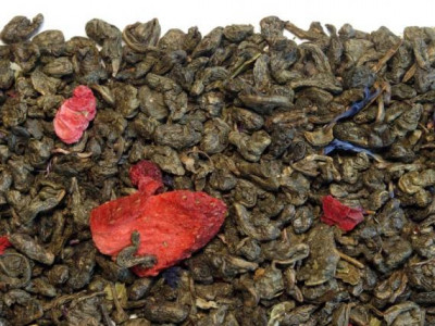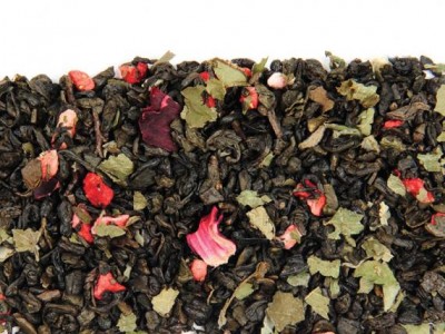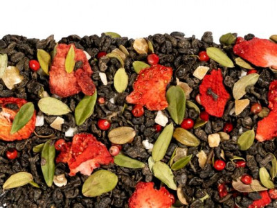 Зеленый чай порох с кусочками клубники и красной смородины, ароматами специй и пряных трав. Необычный аромат напитку придают кусочки лимонной и апельсиновой цедры, дополненные лимонно-сливочным вкусом. Состав: чай зеленый байховый крупнолистовой (Китай), лимонный мирт, лепестки желтой розы, кусочки цедры цитрусовых, ваниль, кусочки ягод клубники, красная смородина, ароматизировано маслами.