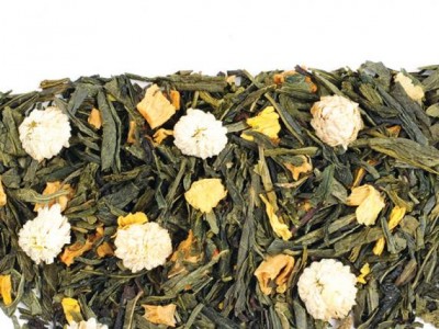 Пикантный чайный сбор на основе зеленого и белого чая, с кусочками персика и цветочными лепестками. Тонкий напиток с ярким ароматом прекрасно бодрит и пробуждает чувства. Состав: чай зеленый рассыпной листовой крупный, кусочки груши, хризантема, лепестки подсолнечника, ароматизировано маслами.