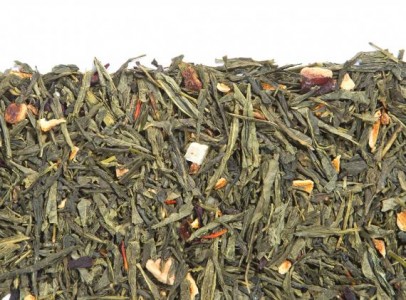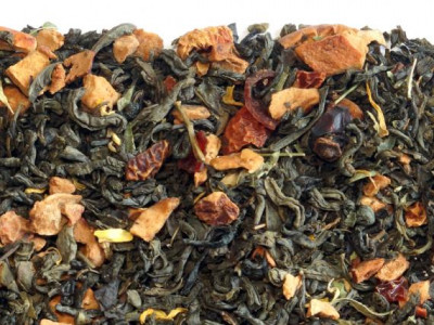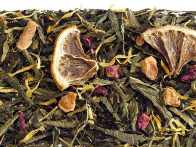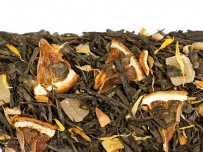 Смесь зелёного китайского чая с цедрой апельсина, кусочками яблока, ананаса, шиповника, гибискуса и лепестками сафлора. Состав: Чай зеленый рассыпной листовой крупный, цедра апельсина, кусочки яблока и ананаса, шиповник, гибискус, лепестки сафлора, ароматизировано маслами.