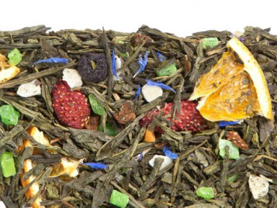 Купаж отборного китайского зелёного чая с изюмом, кусочками яблока, цукатами ананаса, ягодами малины, кусочками земляники и ароматом красного винограда и клубники. Чайный настой обладает освежающим ароматом летних ягод со слегка сладковатыми нотками. Состав - Чай зеленый листовой рассыпной крупный, изюм, кусочки яблока, цукаты ананаса крашеного, ягоды малины, кусочки земляники, ароматизировано маслами.
