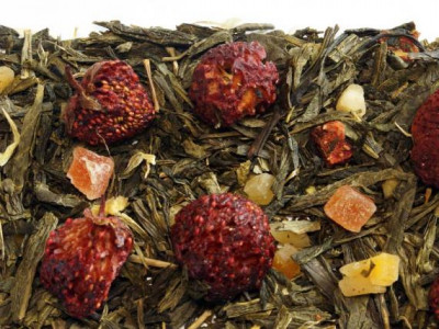 Зеленый китайский крупнолистовой чай в сочетании с клубникой и сливками удивит даже самого изысканого чайного гурмана. Зеленый чай, клубника, лист брусники, перец розовый и цукаты. Состав - чай зеленый рассыпной листовой, кусочки ананаса (ананас, сахар, подкислитель: лимонная кислота), слайсы клубники, цукаты лимона , перец розовый (горошек), лист брусники, ароматизаторы.